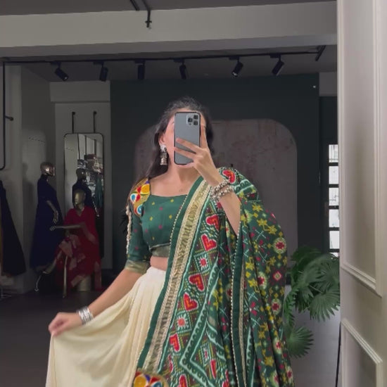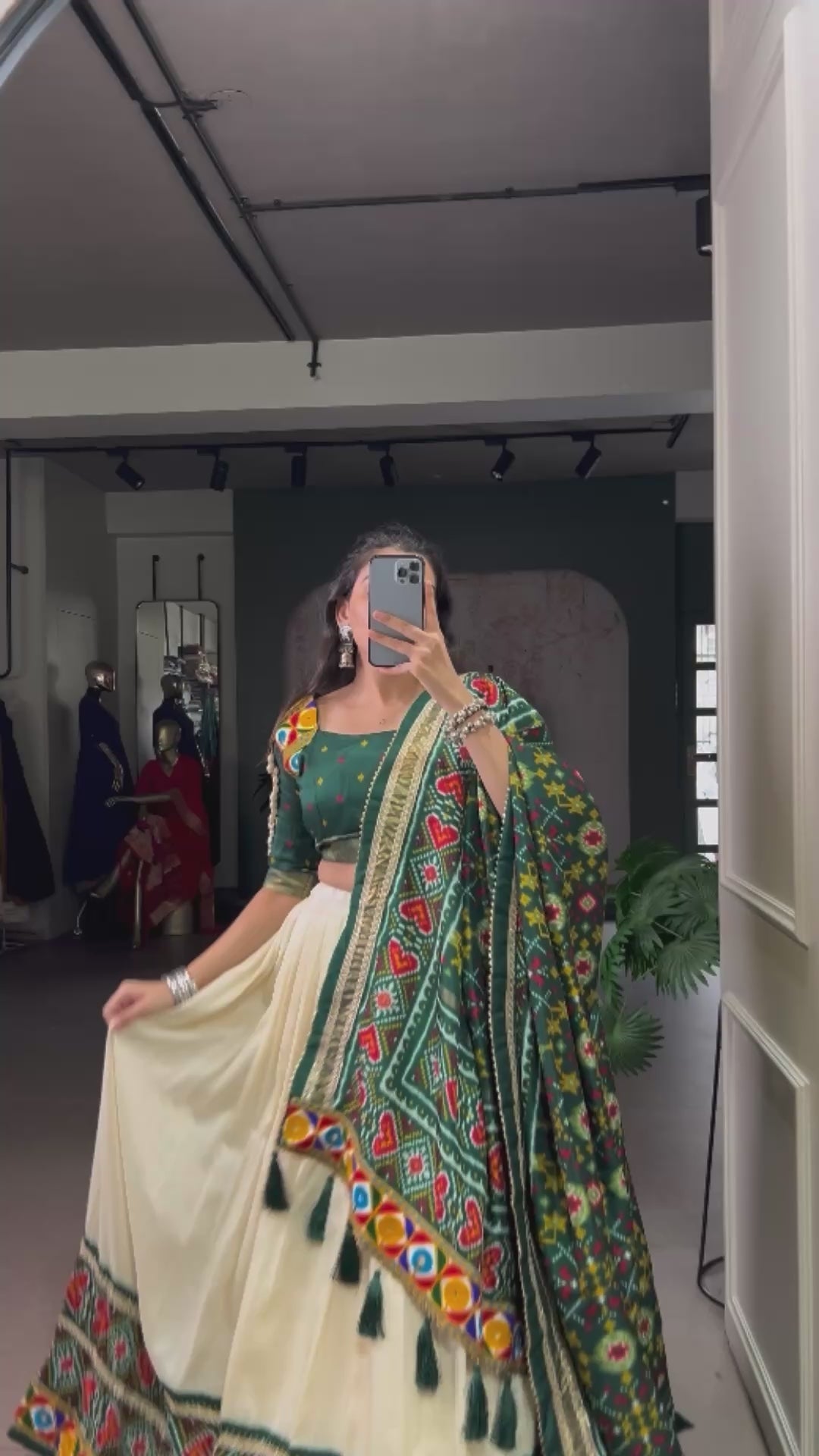 Celebrate Navratri with PatolaGlow ’25, a premium Tasar Silk lehenga set crafted with Patola print, foil accents, real mirror Gamthi work, and a vibrant Bandhej dupatta. Stitched with Can-Can for flair, it’s the perfect outfit for Garba and Dandiya nights. 💃